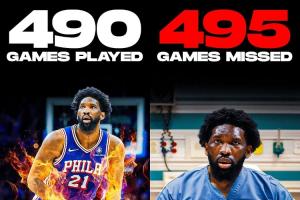 美媒ClutchPoints表示,恩比德NBA生涯至今缺席的场次比出战的场次还多: