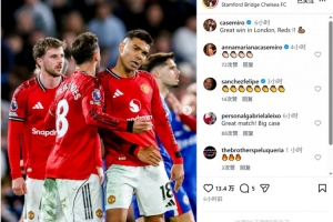 曼联中场卡塞米罗社媒晒出与队友一起庆祝的照片,配文:“在伦敦收获一场重要胜利,红魔!”